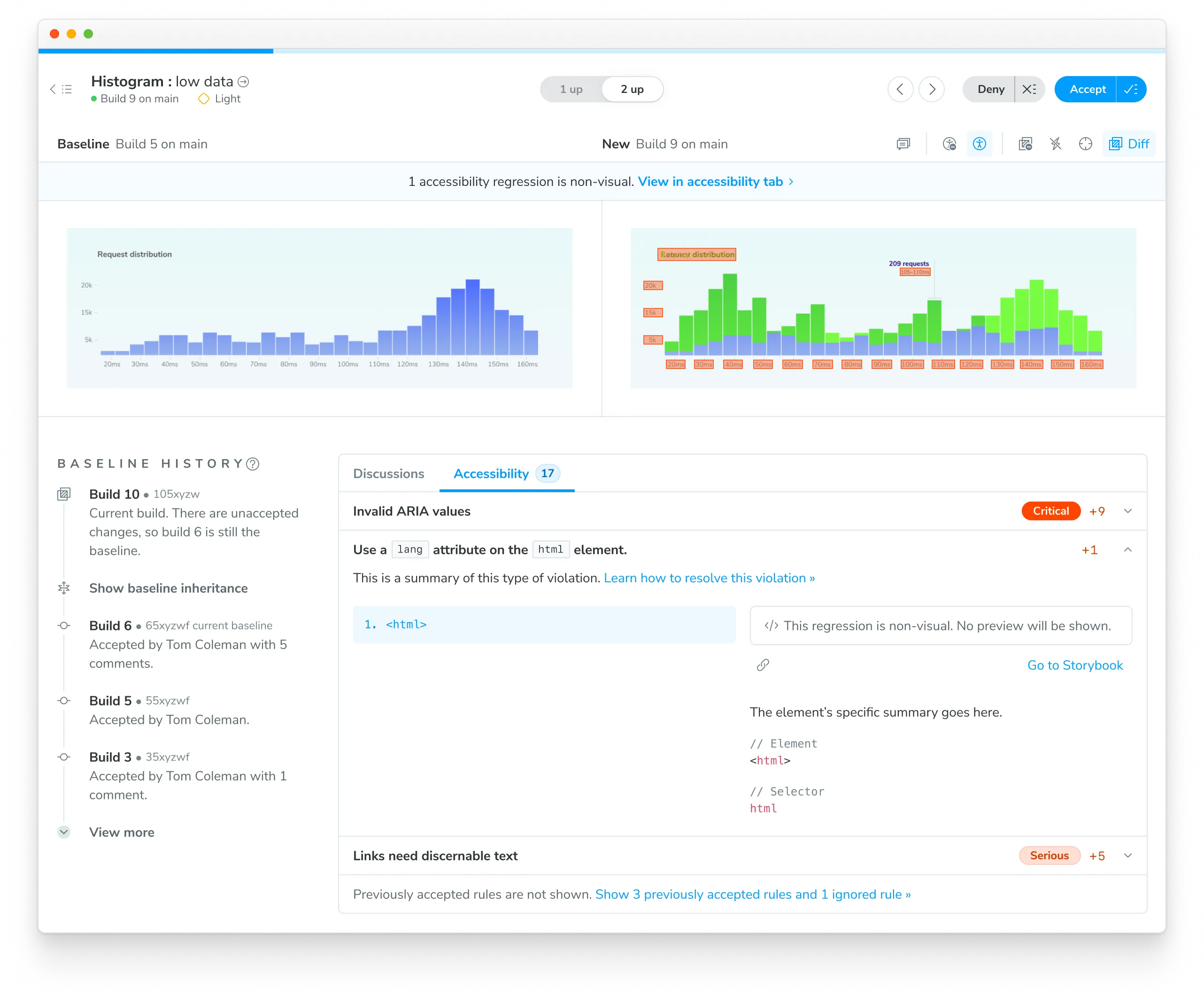 With each build, Chromatic identifies any changes in accessibility violations related to a story. However, it’s up to you to verify if those changes are intentional or if they represent regressions that need to be fixed. Click on a test to view the details.